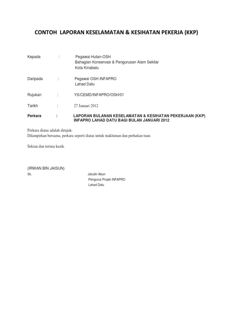 Peraturan-peraturan Keselamatan dan Kesihatan Pekerjaan Jawatankuasa Keselamatan dan Kesihatan 1996. Inilah contoh laporan proses keselamatan kerja di aplikasi excel dan hal lain yang berhubungan erat dengan contoh laporan proses keselamatan kerja di aplikasi excel serta aspek K3 secara umum di Indonesia. Contoh Laporan Kemalangan Di Tempat Kerja Jkkp - Kenyat Jabatan Keselamatan Dan Kesihatan Pekerjaan Melaka Facebook.